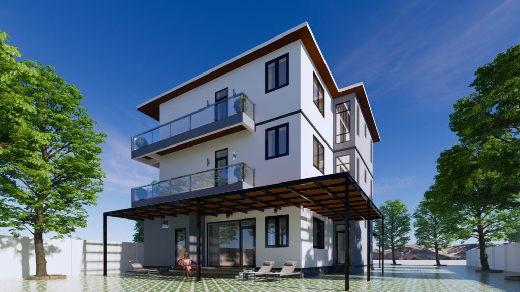 Một ngôi nhà phố 3 tầng gồm 1 trệt 2 lầu mang vẻ đẹp sang trọng, hiện đại. Sẽ vô cùng nổi bật với gam màu trắng kết hợp đường nét thiết kế vững chắc.